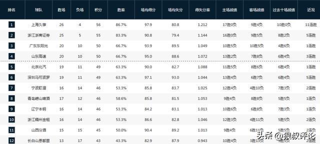 上海男篮112-80大胜山西后,总战绩来到了26胜4负,排在积分榜第一的位置,而这一波11连胜当中,击败了多支季后赛热门球队,以核心阵容保持健康,以及客场都能充分发挥出多人轮换的优势,上海男篮毫无疑问是现阶段最强的球队,没有之一。